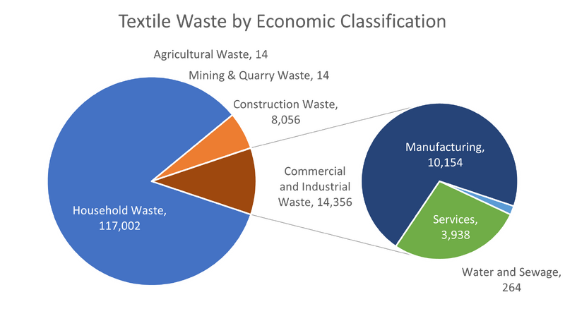 The most recent information published by DEFRA [4] is summarised in the pie chart below, with 139,445 tonnes of textiles generated in the UK in 2020 and is part of the broader tonnage summarized in UK Waste Tonnage:
