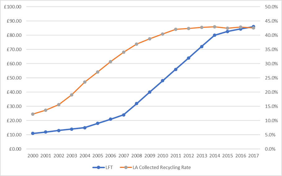 LFT Rates from HMRC plotted against LA collection recycling rates from DEFRA