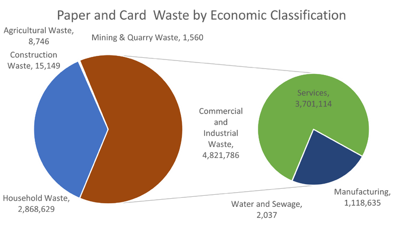 The most recent information published by DEFRA [2] is based on 2020 data and is summarised in the pie chart below, with 7,715,870 tonnes of paper & cardboard wastes generated in the UK in 2020 as part of the broader tonnage reported in UK Waste Tonnage: